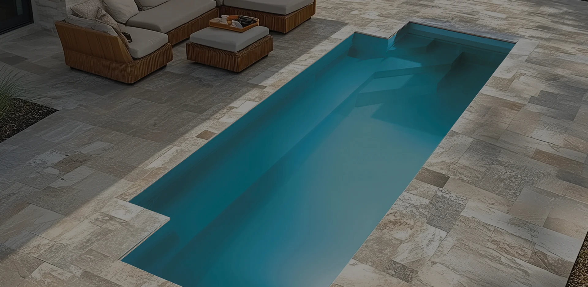 A stylish pool with inset corners, a long ledge and angled steps that offers easy access, safety and plenty of space for relaxing and socialising.